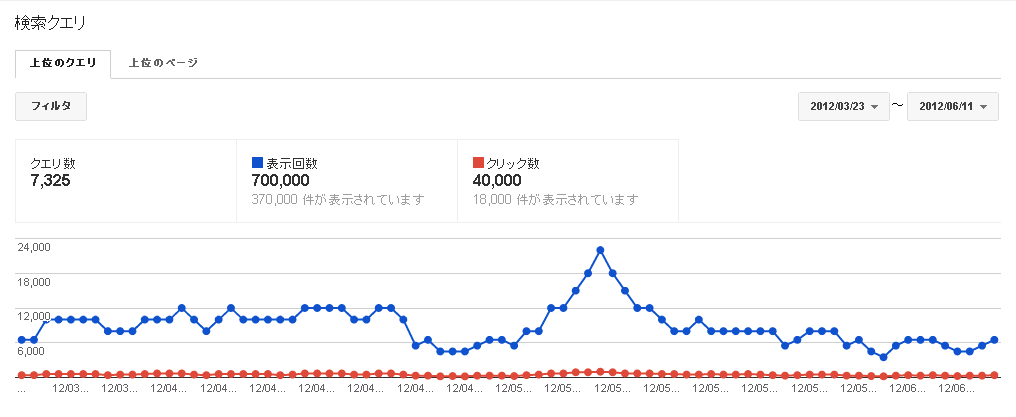 ブログのアクセス数が4月下旬に激減したので、googleのウェブマスターツールをのぞいてみたら、案の定googleでの表示回数がひどいことになっていた。3月から4月中旬までは1日10,000〜12,000回だったのに、4月25日には5,000回と約半減している。その後、5月に急激に盛り返したものの、これは5月10日にデビュー20周年を迎えたミスチル関連の記事へのアクセスが高かったためであり、一時的な要因に過ぎない。6月に入っても、1日5,000回前後の表示回数は変わらず。