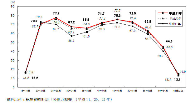 昔はもっと極端なM字カーブを描いていて、これでもだいぶ改善された方である。同省の「平成21年版 働く女性の実情」には、「M字型の底の値は0.6ポイント上昇し、過去最高の65.5%となった」とある。年齢階級別に見ると、労働力率が一番アップしたのは30〜34歳であり、平成20年の65.1%から67.2%へと2.1ポイント上昇している。35〜39歳についても、64.9%から65.5%とわずかながら増加が見られる。